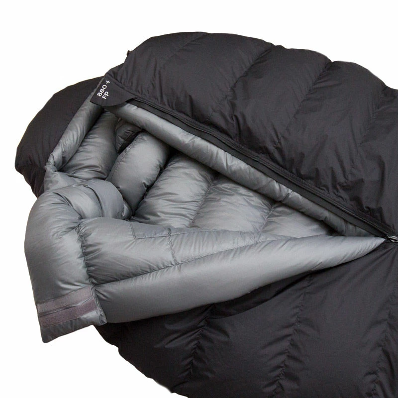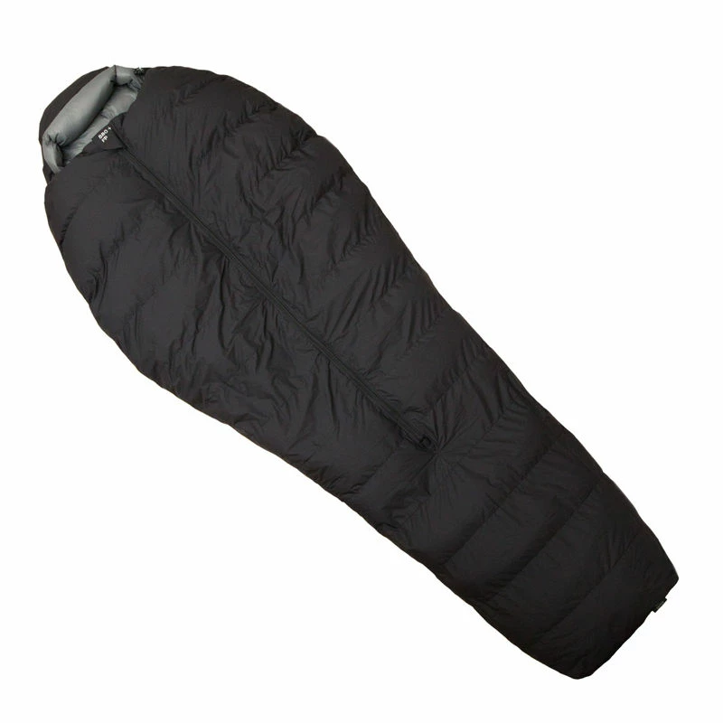 All of our down sleeping bags utilise a central-zip design, featuring a useful protective flap at the top to ensure that your face does not come directly in to contact with the zip. The central-zip is a simple feature which makes a huge difference in the field. Originally found in military sleeping bags, it makes getting in and out of the bag far easier than traditional side-zip designs. More importantly, it allows the user to comfortably sit upright while still keeping their lower body inside the bag, making it possible to change clothes in stages from within the warmth and comfort of your bag. As any cold-weather camper will attest, this is a very welcome feature when the temperature drops!