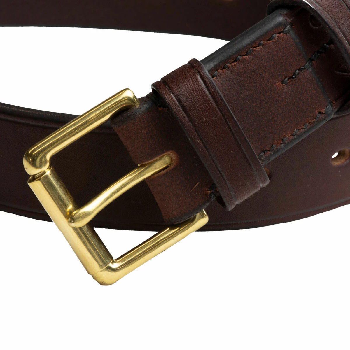 The vegetable tanned leather is hand-dyed to Woodlore’s Rich Brown colour and shows all the beauty of its full natural grain which is further brought out by the dark brown hand burnished, bevelled edges and traditional crease lines. Three rows of hand-stitching using a braided polyester thread secure the heavyweight, solid brass buckle with roller and two leather loops keep the free end of the belt in place; one fixed at the buckle and one free-running.