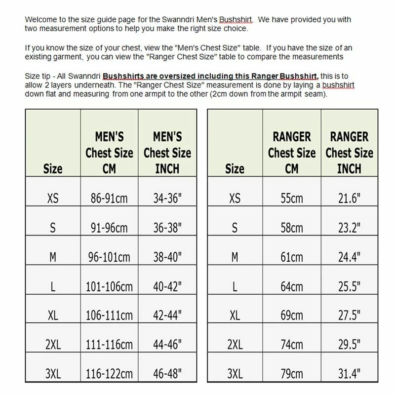 Sizing: Please note that the Swanndri Ranger Shirt features a very generous fit, which allows plenty of room underneath for extra layers. If you do not like your shirts to be loose-fitting, we recommend that you purchase the next size down. Please bear this in mind when placing your order.